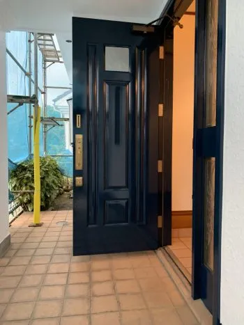 今日は最終日、バルコニーの防水塗装も終えて玄関扉の塗装も美しく仕上がりました!